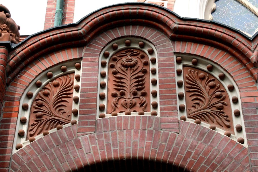 The Town Hall of Subotica stands as one of the most emblematic examples of this style. Constructed between 1908 and 1912 by architects Marcell Komor and Dezső Jakab, its façade and interiors are richly decorated with ceramic tiles featuring floral and folkloric patterns inspired by Hungarian culture. Beyond its decorative qualities, the building also carried ideological significance. Notable examples of this symbolism include the depiction of two birds above the staircase – the Turul bird, a mythical creature central to Hungarian mythology and national identity, and a raven holding a ring in its beak, a symbol associated with King Matthias (also known as the "Raven King") and the House of Corvinus – both representing power and Hungarian national identity.